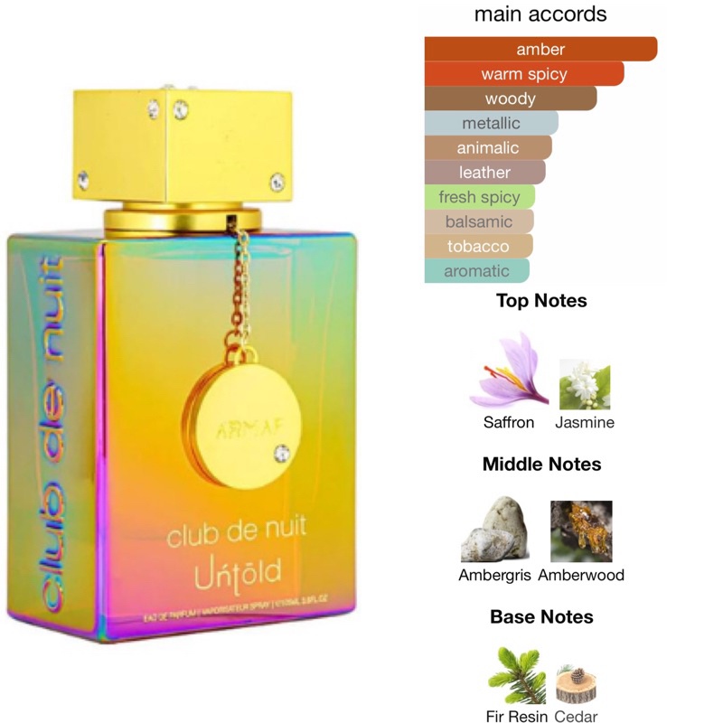 Club De Noit Untold . Club de Nuit Untold Eau de Parfum 105ml Your Perfume Warehouse Club de Nuit Untold de Armaf es una fragancia de la familia olfativa para Hombres y Mujeres Club De Nuit Untold presents a captivating and mysterious fragrance, skillfully blending exotic florals with warm, woody undertones